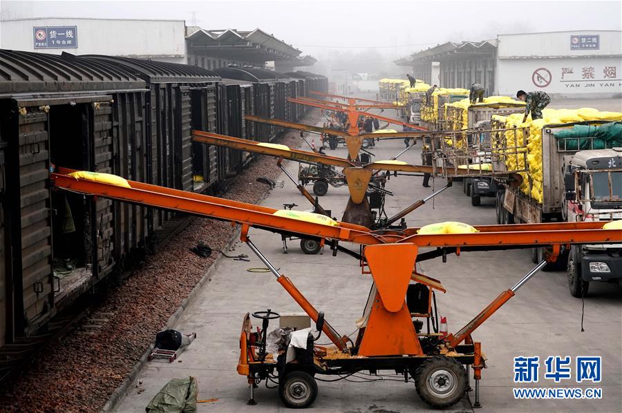 在中國(guó)鐵路鄭州局集團(tuán)有限公司開(kāi)封車(chē)站,工作人員使用傳輸機(jī)裝運(yùn)春耕物資(2月13日攝)。新華社記者 李安 攝