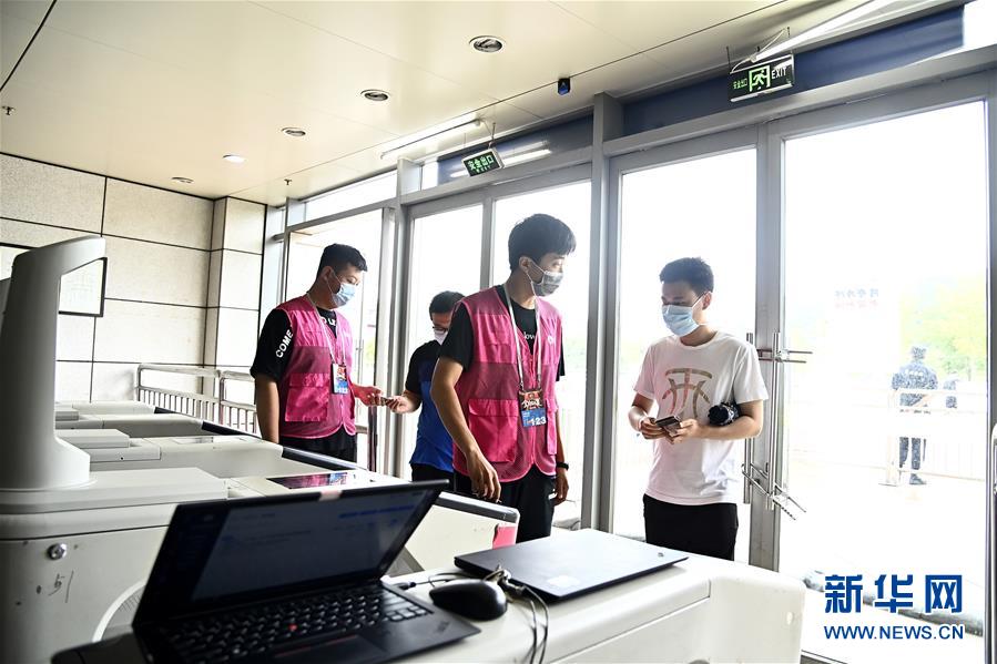7月26日,在青島國信體育館,蘇柯帆(右)正在進場。他成為CBA聯(lián)賽允許觀眾現(xiàn)場觀賽后,首位進場的觀眾。當日,在山東青島舉行的2019-2020賽季中國男子籃球職業(yè)聯(lián)賽(CBA)復(fù)賽第二階段(嶗山賽區(qū))比賽中,醫(yī)護人員、教師、公安戰(zhàn)線人士通過官方購票平臺,完成包括核酸檢測在內(nèi)的相關(guān)流程后進場觀看了上海久事隊迎戰(zhàn)山東西王隊的比賽。觀賽期間,觀賽者須全程佩戴口罩,對號入座,嚴格保持間隔一米就座。退場時,觀眾須按照自后向前、先兩邊后中間的順序,保持“一米線”社交距離有序退場。新華社記者 郭緒雷 攝