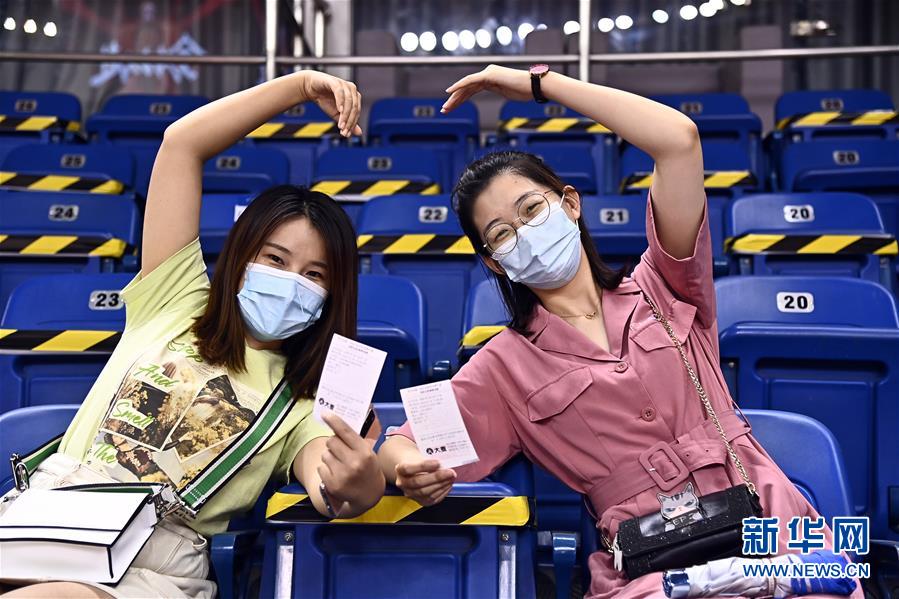 7月26日,在青島國(guó)信體育館,兩位現(xiàn)場(chǎng)觀看比賽的觀眾展示著自己的紙質(zhì)球票。當(dāng)日,在山東青島舉行的2019-2020賽季中國(guó)男子籃球職業(yè)聯(lián)賽(CBA)復(fù)賽第二階段(嶗山賽區(qū))比賽中,醫(yī)護(hù)人員、教師、公安戰(zhàn)線人士通過官方購(gòu)票平臺(tái),完成包括核酸檢測(cè)在內(nèi)的相關(guān)流程后進(jìn)場(chǎng)觀看了上海久事隊(duì)迎戰(zhàn)山東西王隊(duì)的比賽。觀賽期間,觀賽者須全程佩戴口罩,對(duì)號(hào)入座,嚴(yán)格保持間隔一米就座。退場(chǎng)時(shí),觀眾須按照自后向前、先兩邊后中間的順序,保持“一米線”社交距離有序退場(chǎng)。新華社記者 郭緒 雷攝