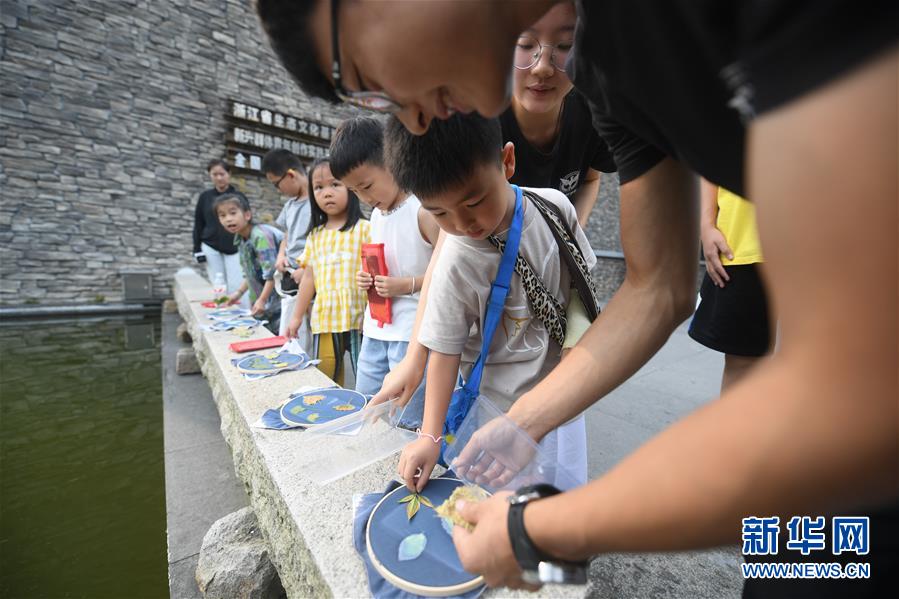7月27日,小朋友們用樹葉制作藍染。新華社記者 翁忻旸 攝