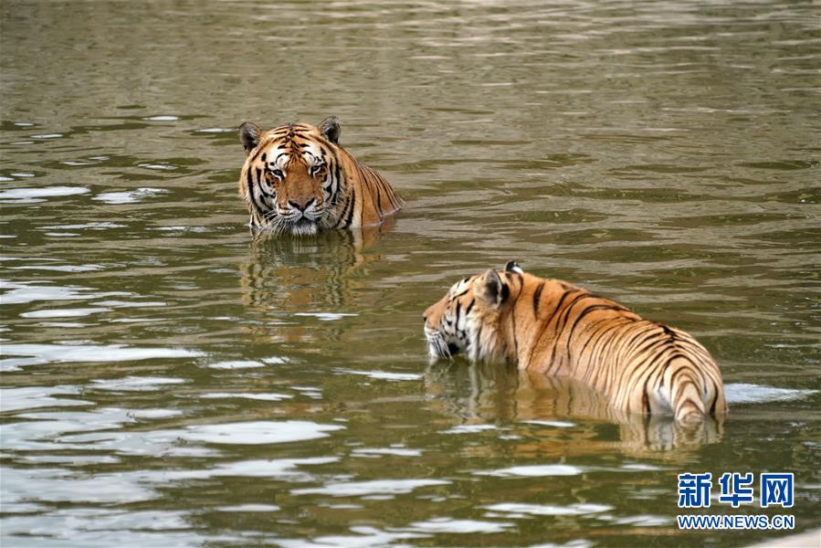 7月28日,在橫道河子東北虎林園,東北虎在水中納涼。時值盛夏,位于黑龍江省海林市的橫道河子東北虎林園的東北虎活動量減少,以不同方式消夏納涼。新華社記者王建威攝
