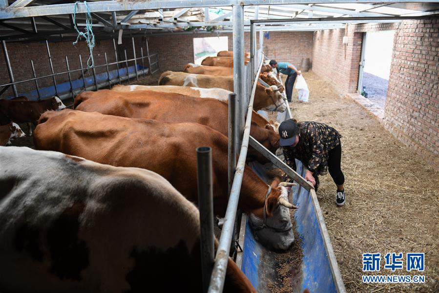 呼格吉勒(后)和妻子薩如拉在自家牛舍給牛喂飼料(7月23日攝)。新華社記者劉磊攝