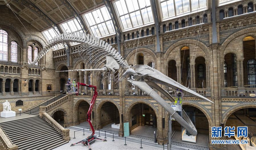 7月27日,工作人員在英國倫敦的自然歷史博物館大廳內(nèi)清潔一具藍(lán)鯨骨架。受新冠疫情影響關(guān)閉數(shù)月的英國自然歷史博物館將于8月5日重新對(duì)外開放,目前館方正在為重新開放做最后準(zhǔn)備。參觀者需要提前預(yù)約參觀時(shí)段、全程佩戴口罩且保持安全距離。新華社記者韓巖攝
