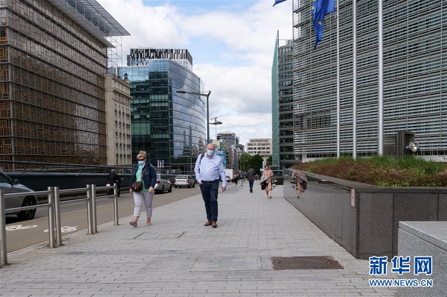 7月29日,在比利時布魯塞爾,戴口罩的行人經(jīng)過歐盟委員會總部大樓。新華社記者張鋮攝