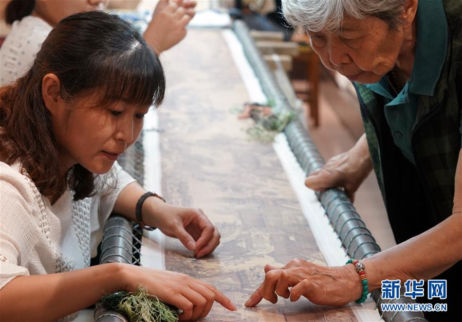 在開(kāi)封市素花宋繡工藝有限公司的展示館里,王素花(右)在指導(dǎo)徒弟刺繡(7月30日攝)。新華社記者李嘉南攝