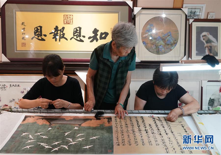 在開(kāi)封市素花宋繡工藝有限公司的展示館里,王素花(中)在指導(dǎo)徒弟們刺繡(7月30日攝)。新華社記者李嘉南攝