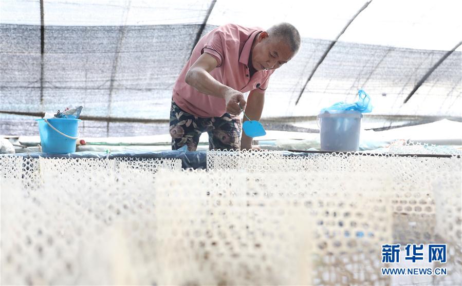 8月4日,張忠堡村村民趙世龍?jiān)谟^察育種筐里的觀賞魚排卵狀況。新華社記者姚劍鋒攝