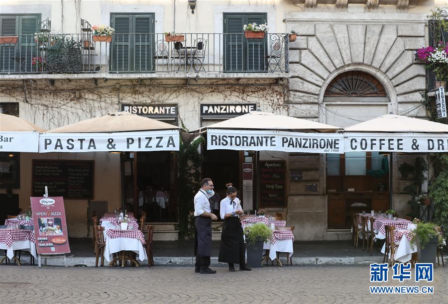 8月4日,在意大利首都羅馬,一家餐廳的工作人員站在門(mén)口招攬顧客。受新冠疫情影響,今年夏天羅馬的歷史中心區(qū)游客比往年明顯減少。新華社記者程婷婷攝