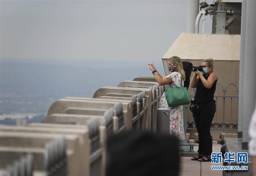 8月6日,在美國紐約,人們在洛克菲勒中心觀景臺上觀看城市景觀。當日,3月份暫時關(guān)閉的洛克菲勒中心觀景臺恢復對公眾開放。每天13時至21時,人們可戴口罩前往參觀。新華社記者王迎攝