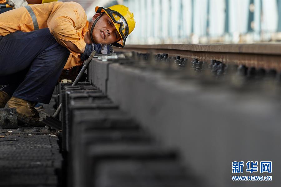 8月6日,橋隧工郭繼浩在南京長江大橋作業(yè)點安裝護(hù)木螺桿。新華社記者李博攝