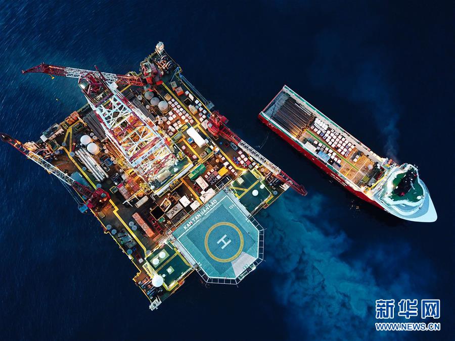 這是7月29日拍攝的正在南海北部海域進(jìn)行鉆探作業(yè)的勘探三號鉆井平臺和為其運(yùn)送物資的拖船(無人機(jī)照片)。新華社記者蒲曉旭攝