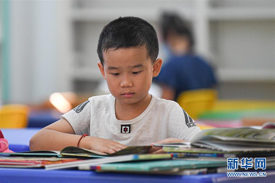 8月8日,小朋友在位于??诘暮D鲜D書館閱讀書籍。暑假期間,許多小朋友來到海南省圖書館閱讀書籍,在書香中度過快樂暑假。新華社記者 蒲曉旭 攝