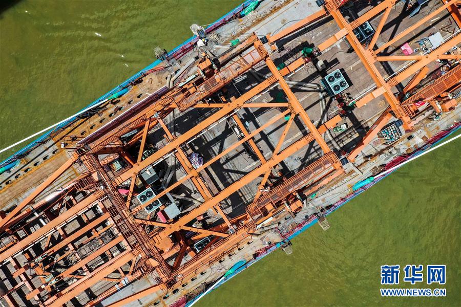 8月9日拍攝的廣州南沙港鐵路跨西江特大斜拉橋最后一塊鋼箱梁吊裝施工現(xiàn)場(chǎng)(無(wú)人機(jī)照片)。當(dāng)日,中鐵十一局承建的粵港澳大灣區(qū)基礎(chǔ)設(shè)施“硬聯(lián)通”重點(diǎn)工程——廣州南沙港鐵路跨西江特大斜拉橋完成最后一塊鋼箱梁吊裝作業(yè),大橋即將合龍。該橋位于廣東佛山市和江門(mén)市交界處,全長(zhǎng)1117.5米。新華社記者劉大偉攝。