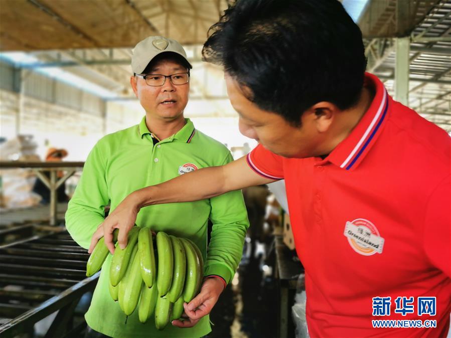 7月16日,在柬埔寨桔井省的柬埔寨—中國熱帶生態(tài)農(nóng)業(yè)合作示范區(qū)內(nèi),綠洲農(nóng)業(yè)發(fā)展(柬埔寨)有限公司總經(jīng)理高冠華(右)和公司香蕉產(chǎn)業(yè)技術(shù)副總監(jiān)吳誠檢查香蕉的品質(zhì)(手機(jī)拍攝)。新華社記者毛鵬飛攝。