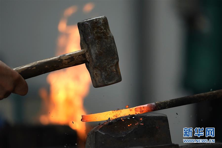 8月10日,甘肅省臨夏回族自治州積石山縣大河家鎮(zhèn)的村民在制作保安腰刀。新華社記者邢廣利攝。