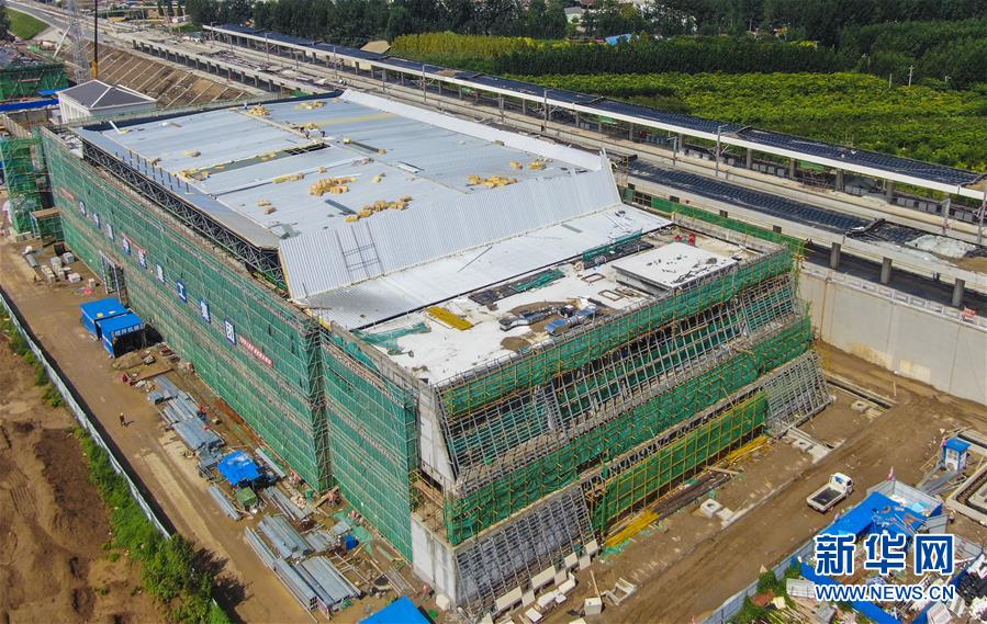8月10日拍攝的建設(shè)中的京雄城際鐵路霸州北站(無人機照片)。京雄城際鐵路霸州北站站臺雨棚混凝土結(jié)構(gòu)施工日前全部完成,目前霸州北站已全面轉(zhuǎn)入裝飾裝修和機電安裝階段,預(yù)計2020年底投入使用。京雄城際鐵路是連接北京市區(qū)、大興機場和雄安新區(qū)的重要干線。建成后,將進一步完善京津冀區(qū)域高速鐵路網(wǎng)結(jié)構(gòu),便利沿線群眾出行,對于推動京津冀協(xié)同發(fā)展和支撐建設(shè)雄安新區(qū)具有重要意義。新華社記者李曉果攝。