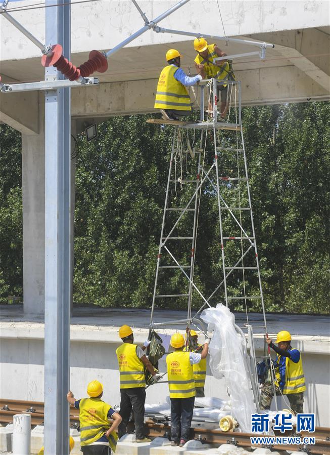 8月10日,工人在京雄城際鐵路霸州北站建設(shè)工地為接觸網(wǎng)卡定位。京雄城際鐵路霸州北站站臺雨棚混凝土結(jié)構(gòu)施工日前全部完成,目前霸州北站已全面轉(zhuǎn)入裝飾裝修和機電安裝階段,預(yù)計2020年底投入使用。京雄城際鐵路是連接北京市區(qū)、大興機場和雄安新區(qū)的重要干線。建成后,將進一步完善京津冀區(qū)域高速鐵路網(wǎng)結(jié)構(gòu),便利沿線群眾出行,對于推動京津冀協(xié)同發(fā)展和支撐建設(shè)雄安新區(qū)具有重要意義。新華社記者李曉果攝。