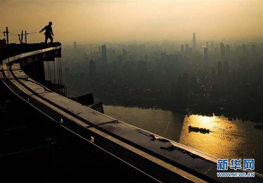 8月11日,工人在武漢綠地中心項目建設現(xiàn)場近500米的高空施工。