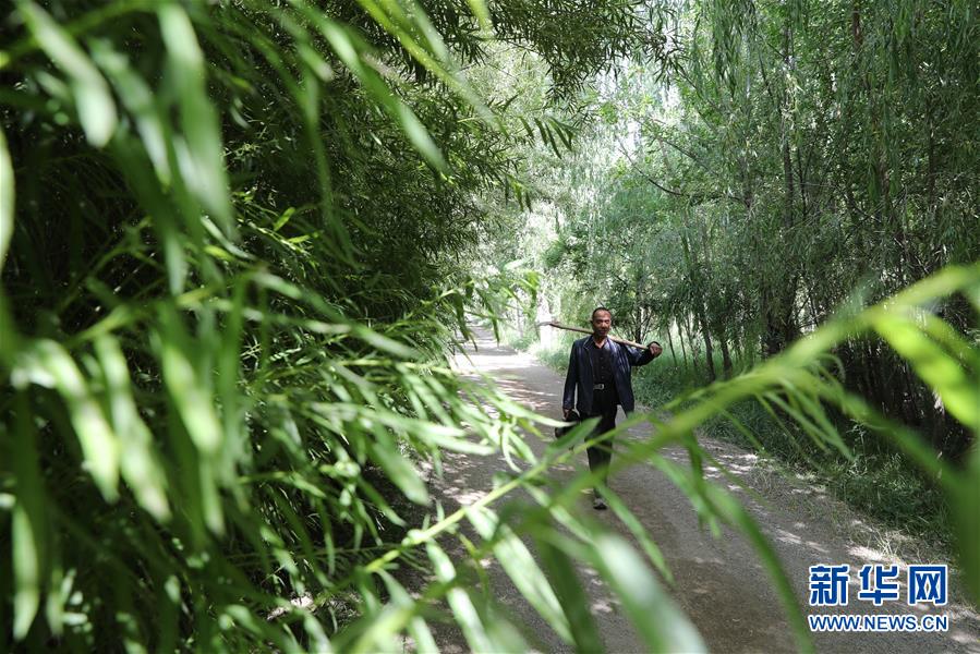 甘肅省金昌市永昌縣下四壩村村民徐文國(guó)走在林間小道上,兩旁的樹(shù)都是他15年前栽的(7月10日攝)。新華社記者 杜哲宇 攝