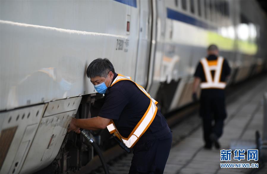 8月12日,長(zhǎng)春火車站客運(yùn)車間上水工王軍在給列車上水。進(jìn)入暑運(yùn)高峰,為了保障列車正常用水,每當(dāng)一列火車停靠車站,長(zhǎng)春火車站的上水工就冒著酷暑將水管插進(jìn)火車底部的輸水口,快速準(zhǔn)確完成輸水作業(yè)。新華社記者 林宏 攝