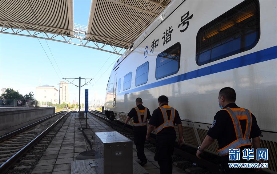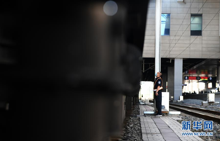 8月12日,長春火車站客運車間上水工韓冰等候列車停站。新華社記者 林宏 攝