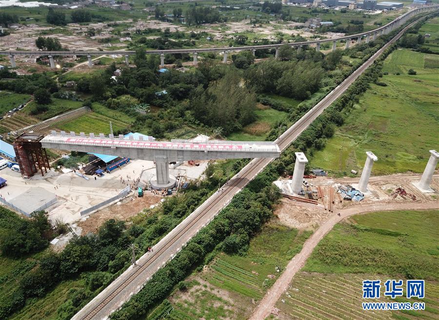 這是8月12日拍攝的水蚌鐵路蚌埠段改線工程東站疏解線特大橋跨越京滬鐵路上行線轉(zhuǎn)體梁轉(zhuǎn)體施工現(xiàn)場(無人機照片)。新華社記者 劉軍喜 攝