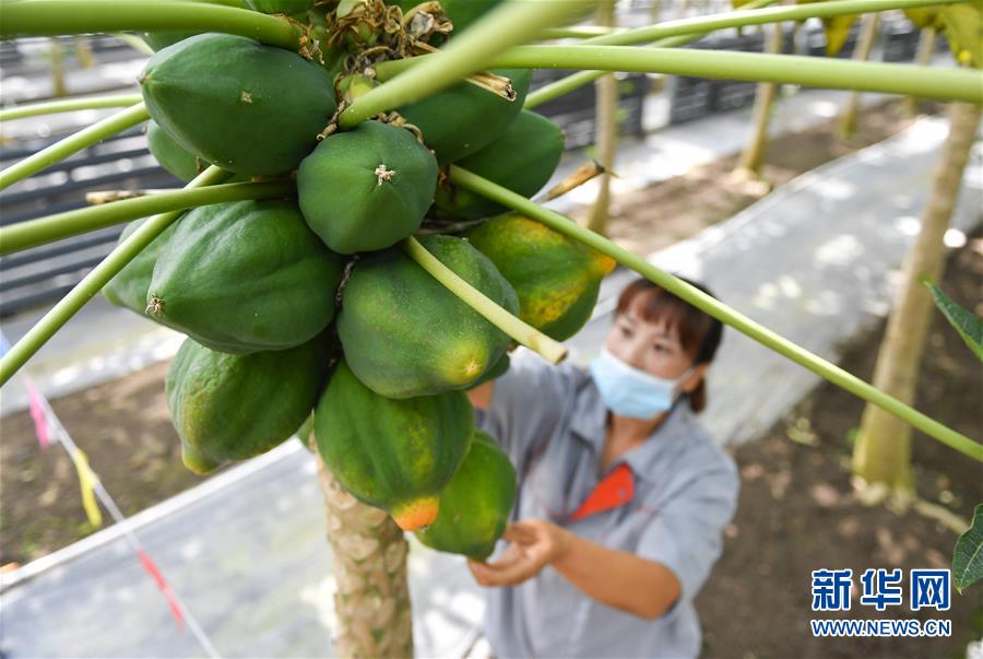 在吉林省永吉縣萬昌鎮(zhèn)宇豐紅果木瓜產(chǎn)業(yè)園,工作人員在大棚內(nèi)管護木瓜(8月12日攝)。新華社記者 許暢 攝