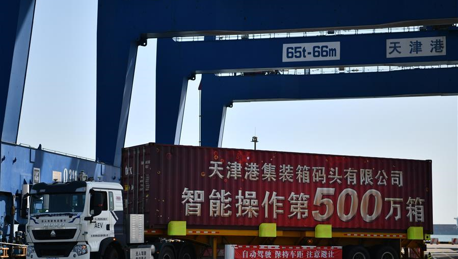 在天津港集裝箱碼頭有限公司北區(qū)智能碼頭自動化堆場,裝載著集裝箱的無人駕駛電動集裝箱卡車向碼頭駛去。