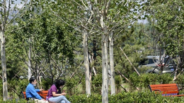 5月24日,北京大興區(qū)舊宮鎮(zhèn)居民在剛剛建成開放的森林公園內(nèi)休閑。