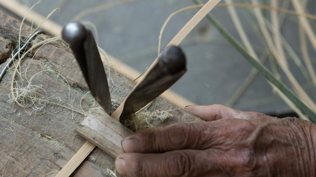 5月12日,浙江諸暨龍溪村的百歲老人蔡渭東在家中處理竹篾。