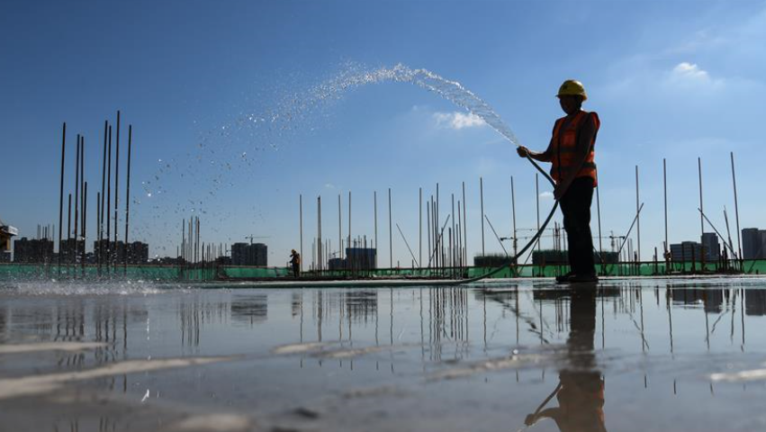 8月3日,工人在長江文創(chuàng)產業(yè)園項目工地工作平面澆水降溫。