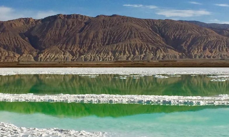 在青海柴達木盆地最西部的茫崖有一處硫酸鎂亞型人工鹽湖,以其翡翠綠色的鹽田與藍天白云和附近的丹霞地貌相映。