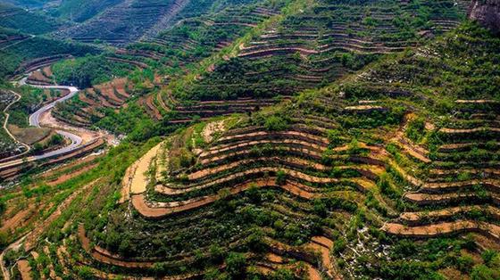 這是5月6日無人機拍攝的涉縣關(guān)防鄉(xiāng)后池村梯田和公路。初夏時節(jié),河北省邯鄲市涉縣山間的梯田綠意盎然,猶如一幅幅美麗畫卷。