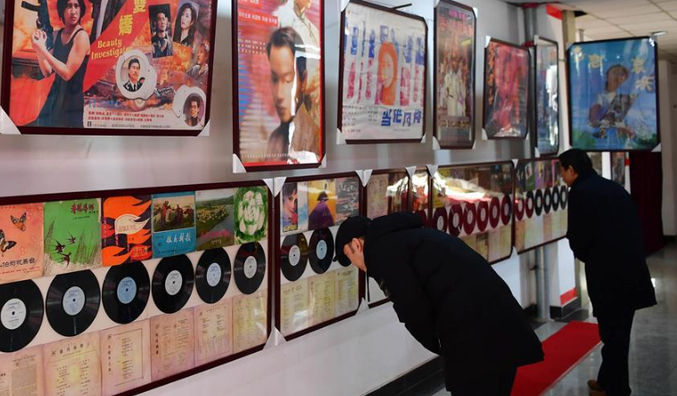在河南洛陽隋唐百戲城舉行的“百花齊放春滿園”電影海報與唱片展上,一幅幅制作精美的海報、一張張泛著時光印記的唱片展示著改革開放40年國家和社會的巨變。