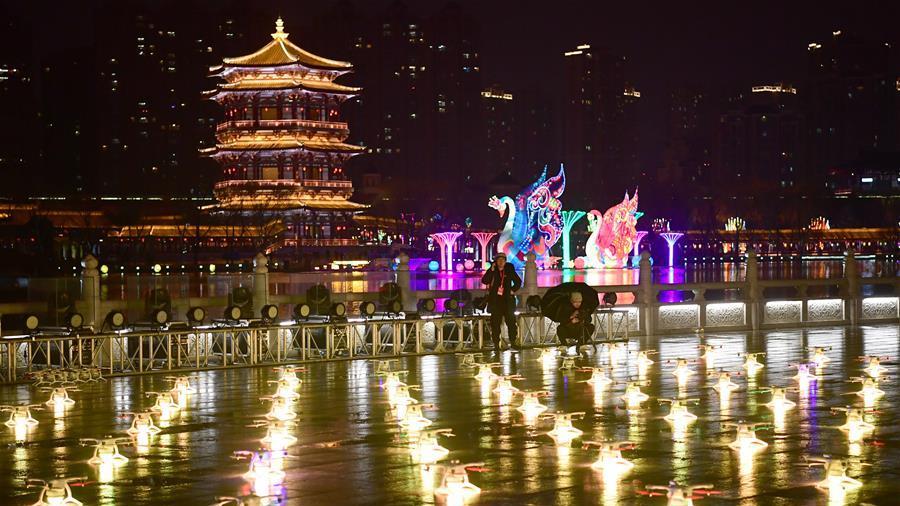 2月20日,300架無人機(jī)分為A、B兩組,通過動態(tài)飛行和燈光變化在空中展示出多種不同造型,為市民和游客帶來新奇的新春視覺盛宴。