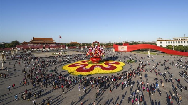 10月14日,以“花果籃”為主造型的天安門廣場中心花壇吸引了眾多游客參觀拍照。“花果籃”的夜景更是流光溢彩,絢爛迷人。