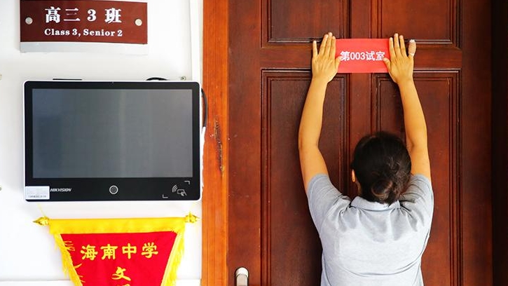 7月7日,在吉林省長(zhǎng)春市的東北師范大學(xué)附屬中學(xué)考點(diǎn)外,執(zhí)勤交警在道路上架設(shè)提示牌。