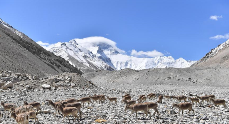 5月8日,一群巖羊在珠峰大本營周圍覓食,黃嘴山鴉飛到巖羊身上停留,構(gòu)成一幅幅生動(dòng)有趣的雪域圖畫。