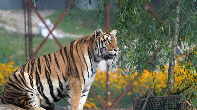 7月28日在橫道河子?xùn)|北虎林園拍攝的在水中納涼的東北虎。時值盛夏,位于黑龍江省海林市的橫道河子?xùn)|北虎林園的東北虎活動量減少,以不同方式消夏納涼。