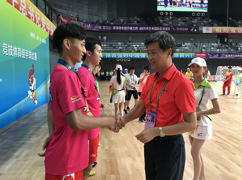 深圳新聞網(wǎng)訊 繼20日結(jié)束的高爾夫球賽奪冠后,深圳代表隊(duì)在廣東省運(yùn)會再下一金。7月21日,在為期5天的肇慶男子青少年組手球比賽中,深圳手球隊(duì)以35∶29打敗廣州隊(duì)奪得了冠軍,這是深圳男子手球隊(duì)在省運(yùn)會上獲得的第一個五連冠,也是深圳代表團(tuán)獲得的第一個集體項(xiàng)目金牌。深圳文體旅游局副局長韓星元現(xiàn)場為深圳男子青少年手球隊(duì)頒發(fā)金牌。