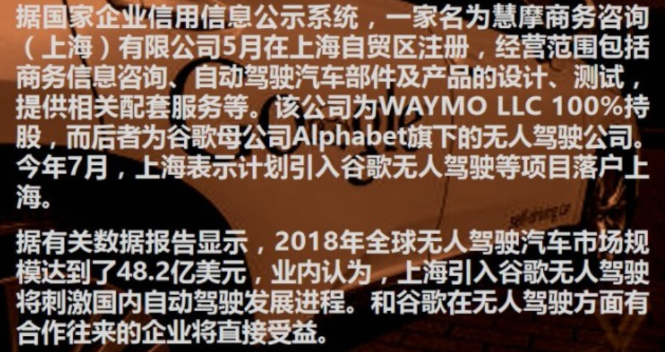 谷歌母公司Alphabet旗下研究自動駕駛的部門Waymo在自動駕駛領域處于全球領先水平,當前其已經(jīng)完成800萬英里(約1287萬公里)自動駕駛汽車公共道路測試,模擬測試里程達到50億英里(約80.47億公里)。Waymo計劃在為今年下半年向部分地區(qū)的美國消費者推出無人駕駛服務。