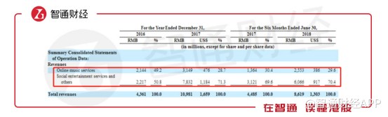 可以看到,2017年上半年,公司在線音樂服務(wù)與以音樂為核心的社交娛樂服務(wù)分別占到總收入的28.7%和71.3%,而在2018年上半年,這兩個(gè)數(shù)值為29.6%和70.4%。也就是說(shuō),社交娛樂服務(wù)為騰訊音樂的“核心業(yè)務(wù)”。