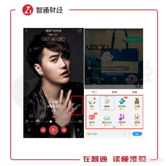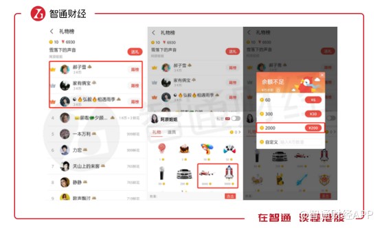 在用戶進(jìn)入K歌界面后,除了K歌按鍵還有就是歌曲榜單,這些榜單記錄的是該歌曲翻唱獲得禮物數(shù)的排行情況。翻唱歌手被打賞的禮物越多,榜單排名越高,禮物則是靠用戶通過現(xiàn)金兌換而來(lái)。與直播打賞類似,全民K歌也是通過用戶購(gòu)買虛擬禮物進(jìn)行變現(xiàn)。