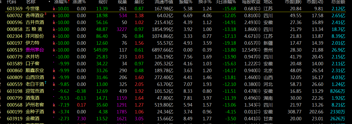 云財(cái)經(jīng)訊,10月29日早間,白酒股集體暴跌,截至發(fā)稿,貴州茅臺(600519)、洋河股份(002304)、口子窖(603589)、順鑫農(nóng)業(yè)(000860)跌停、五糧液(000858)逼近跌停。據(jù)統(tǒng)計(jì),近5個交易日,A股白酒板塊總市值縮水超3400億元。消息面上,今年貴州茅臺(600519)前三季度的業(yè)績增速有所放緩。公司第三季度的凈利實(shí)際同比增長率僅為2.71%。