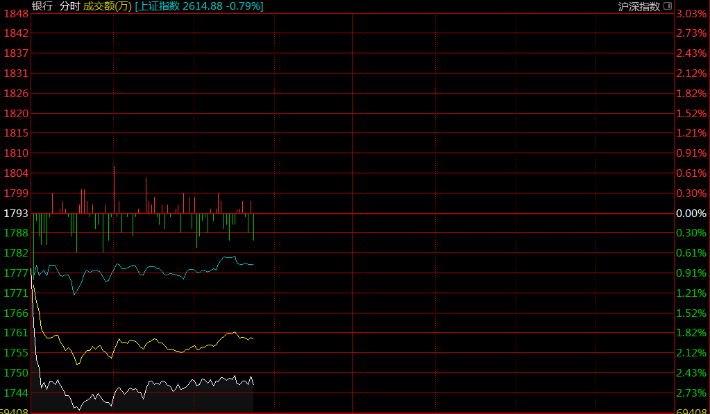 銀行板塊全線殺跌,寧波銀行(002142)跌4%,招商銀行(600036)、農(nóng)業(yè)銀行(601288)、建設(shè)銀行(601939)跌3%。