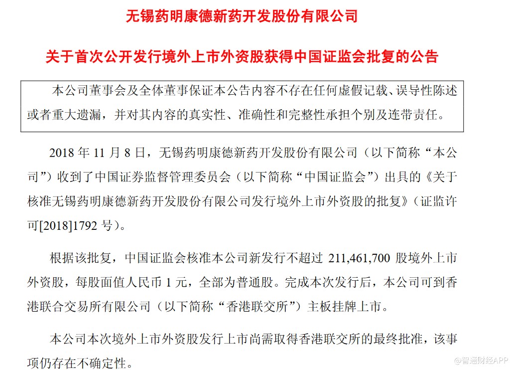 根據(jù)該批復(fù),中國(guó)證監(jiān)會(huì)核準(zhǔn)藥明康德新發(fā)行不超過(guò)2.11億股境外上市外資股,每股面值人民幣1元,全部為普通股。完成本次發(fā)行后,藥明康德可到香港聯(lián)交所主板掛牌上市。