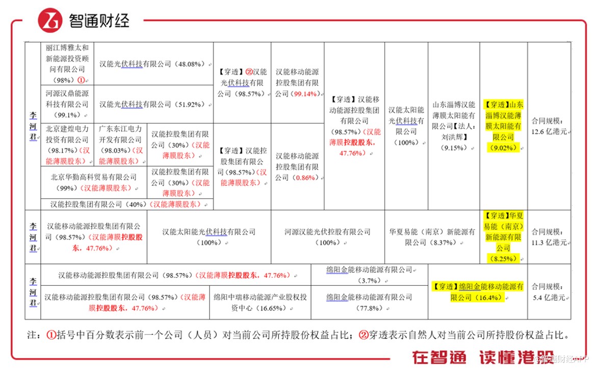 漢能移動又通過持股其它公司,間接持有山東淄博漢能薄膜太陽能有限公司(淄博漢能)9.15%股權,穿透股權發(fā)現(xiàn)李河君持有淄博漢能9.02%股權。