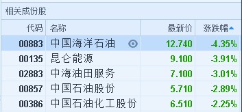 智通財(cái)經(jīng)APP獲悉,國(guó)際原油價(jià)格大跳水,港股石油股早盤股價(jià)遭重創(chuàng),截至9時(shí)20分,中海油(00883)跌4.35%,報(bào)價(jià)12.74港元,昆侖能源(00135)跌3.91%,報(bào)9.1港元,中石油(00857)跌2.89%,中石化(00386)跌2.25%。