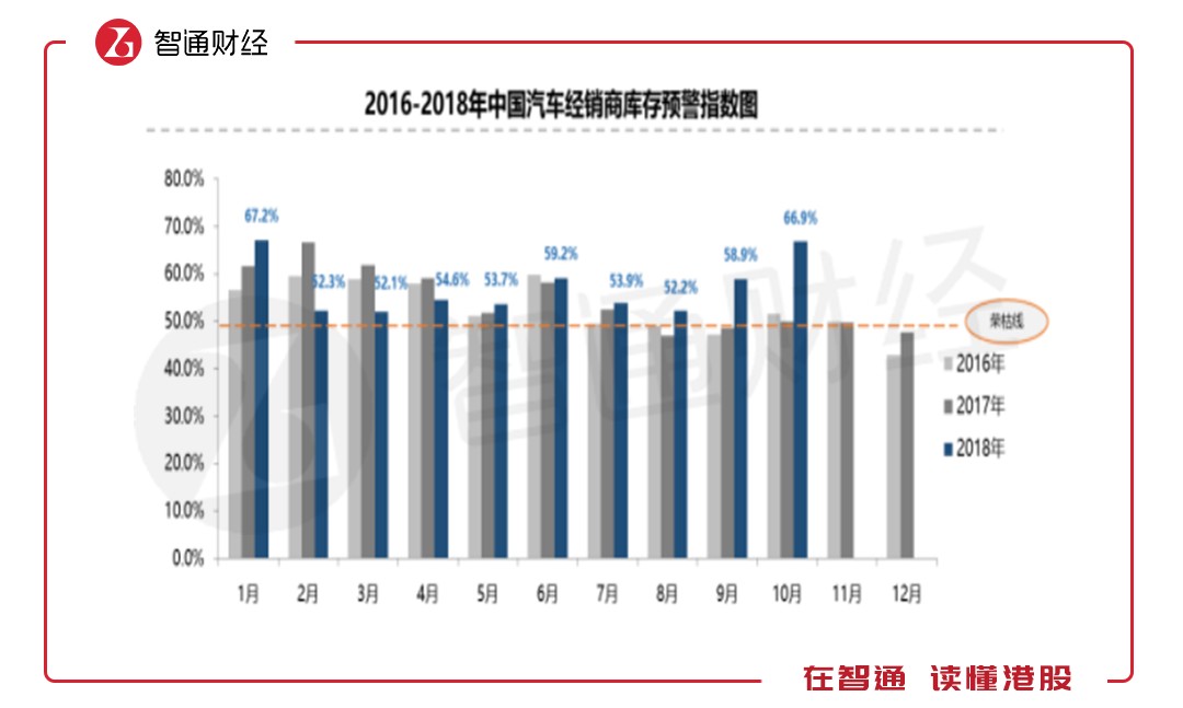實(shí)際上,從汽車(chē)制造到最終消費(fèi)者,流通過(guò)程要通過(guò)經(jīng)銷(xiāo)商,中汽協(xié)近日公布了經(jīng)銷(xiāo)商庫(kù)存預(yù)警指數(shù),顯示下半年以來(lái),庫(kù)存預(yù)警指數(shù)均高于前兩年,10月份創(chuàng)出新高,預(yù)警指數(shù)達(dá)66.9%,而榮枯線(xiàn)為50%,汽車(chē)庫(kù)存堪憂(yōu),未來(lái)兩個(gè)月消化難度依然很大。