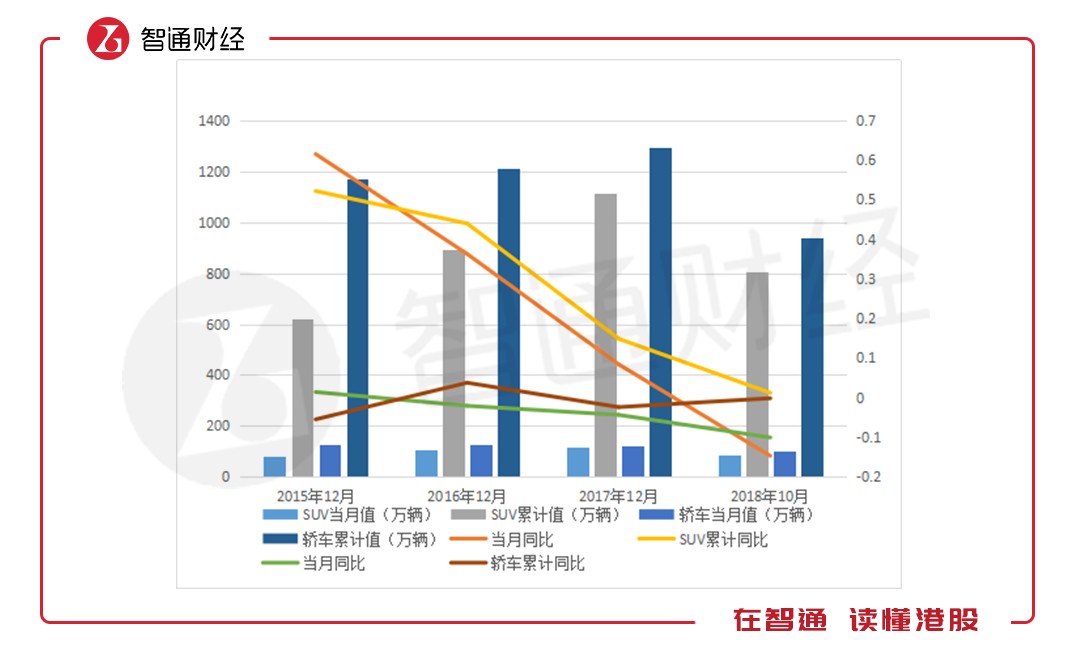 轎車(chē)和SUV車(chē)型在2018年首10月銷(xiāo)量合計(jì)約1749萬(wàn)輛,分別占據(jù)了汽車(chē)以及乘用車(chē)76.5%和90.6%的份額,這兩類(lèi)車(chē)型的消費(fèi)表現(xiàn)代表了整個(gè)汽車(chē)以及乘用車(chē)行業(yè)的景氣情況。